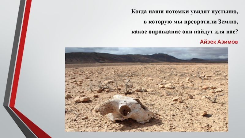 Когда наши потомки увидят пустыню, в которую мы превратили Землю, какое оправдание они найдут для нас?Айзек Азимов