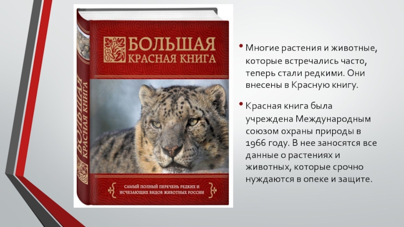 Красная книга была учреждена Международным союзом охраны природы в 1966 году. В нее заносятся все данные о растениях и животных, которые срочно нуждаются в опеке и защите.