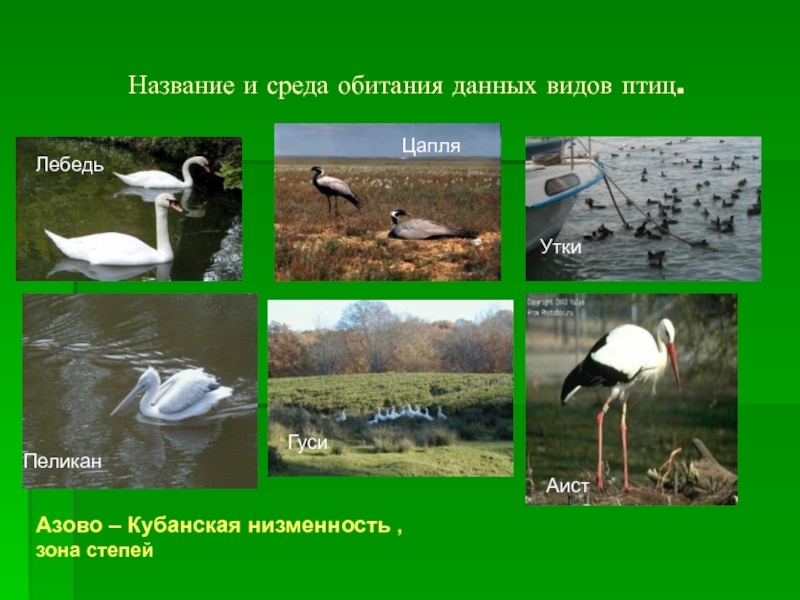 Название и среда обитания данных видов птиц.ЛебедьЦапляУткиПеликанГусиАистАзово – Кубанская низменность , зона степей