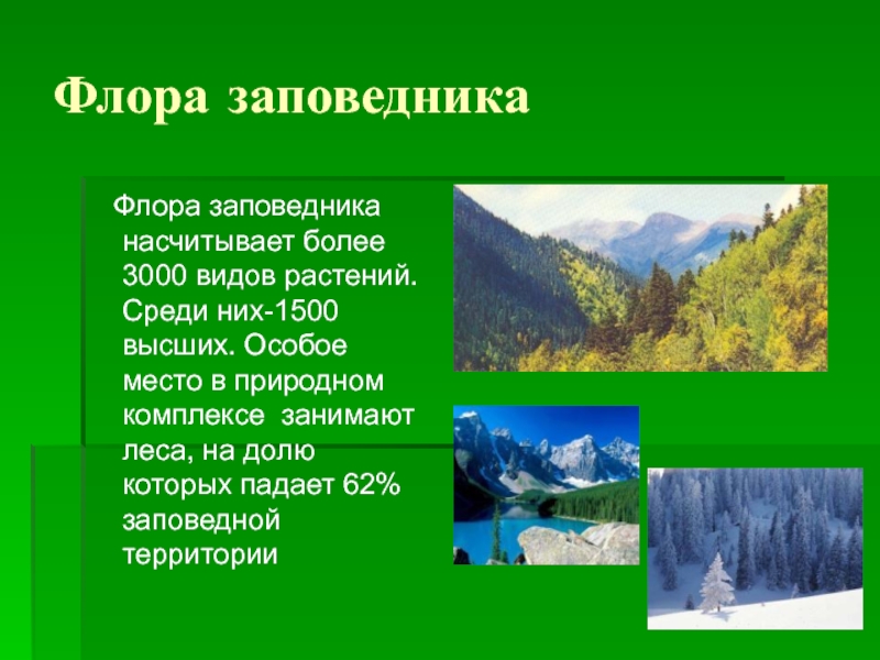 Флора заповедника  Флора заповедника насчитывает более 3000 видов растений. Среди них-1500 высших. Особое место в природном