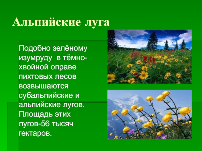 Альпийские лугаПодобно зелёному изумруду в тёмно-хвойной оправе пихтовых лесов возвышаются субальпийские и альпийские лугов. Площадь этих лугов-56