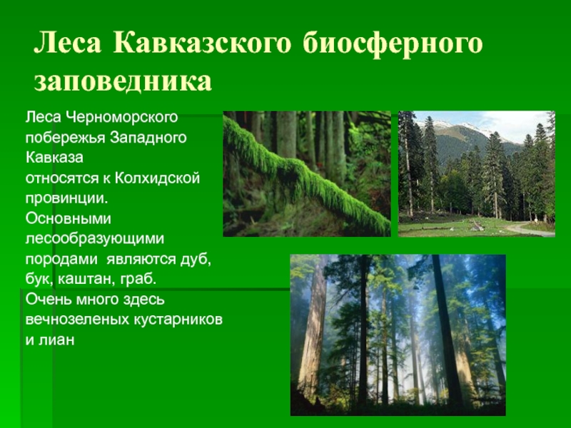 Леса Кавказского биосферного заповедникаЛеса Черноморскогопобережья ЗападногоКавказаотносятся к Колхидскойпровинции.Основнымилесообразующимипородами являются дуб,бук, каштан, граб.Очень много здесьвечнозеленых кустарникови лиан