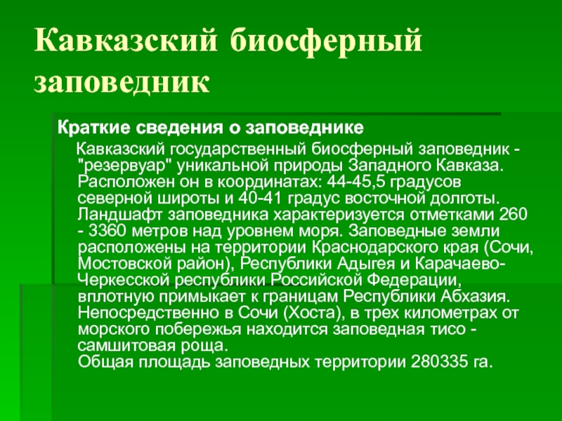 Кавказский биосферный заповедникКраткие сведения о заповеднике   Кавказский государственный биосферный заповедник -