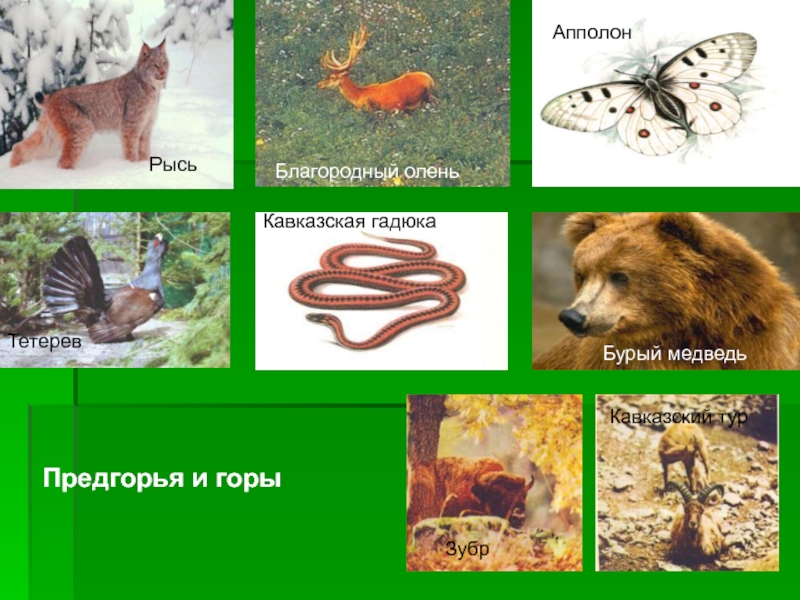 РысьАпполонКавказская гадюкаТетеревБлагородный оленьБурый медведьКавказский турЗубрПредгорья и горы
