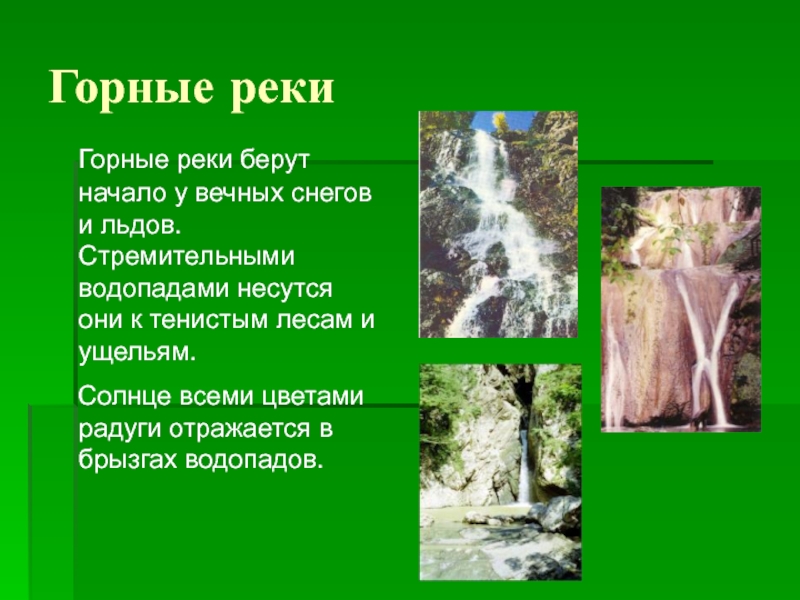 Горные реки  Горные реки берут начало у вечных снегов и льдов. Стремительными водопадами несутся они к