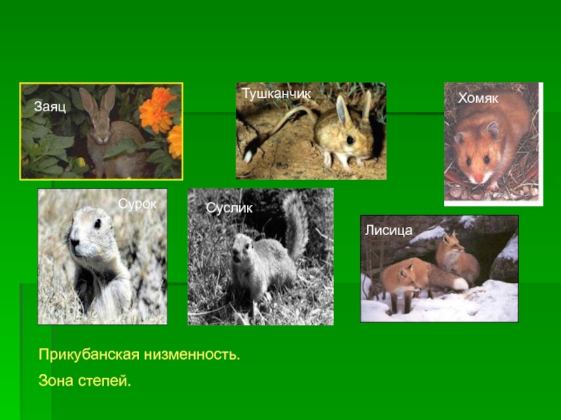 ЗаяцТушканчикХомякСурокСусликЛисицаПрикубанская низменность.Зона степей.