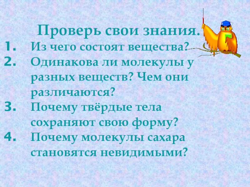 Проверь свои знания.Из чего состоят вещества?Одинакова ли молекулы у разных веществ? Чем они различаются?Почему твёрдые тела сохраняют свою форму?Почему молекулы сахара становятся невидимыми?