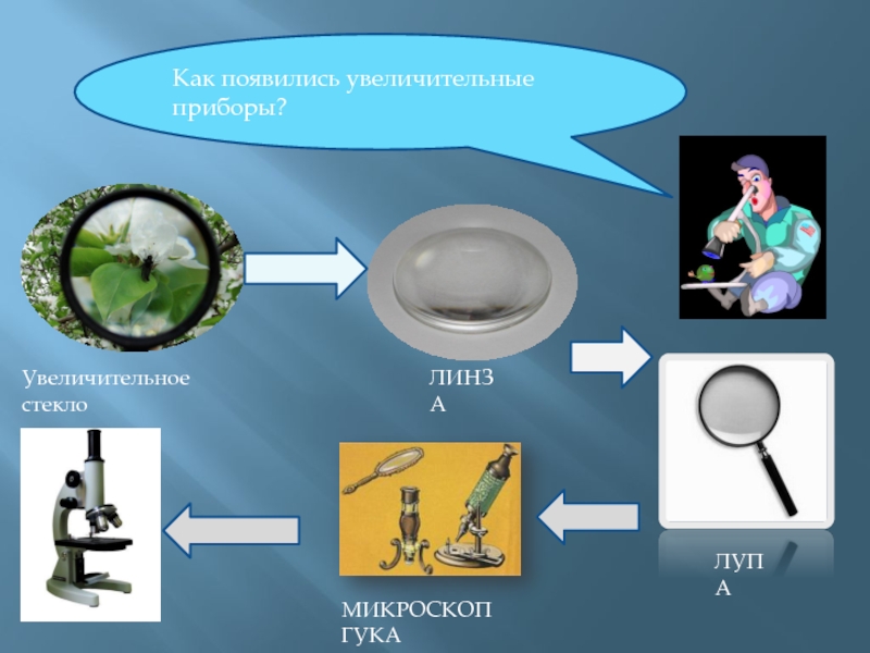 Как появились увеличительные приборы?Увеличительное стеклоЛИНЗАЛУПАМИКРОСКОП ГУКА