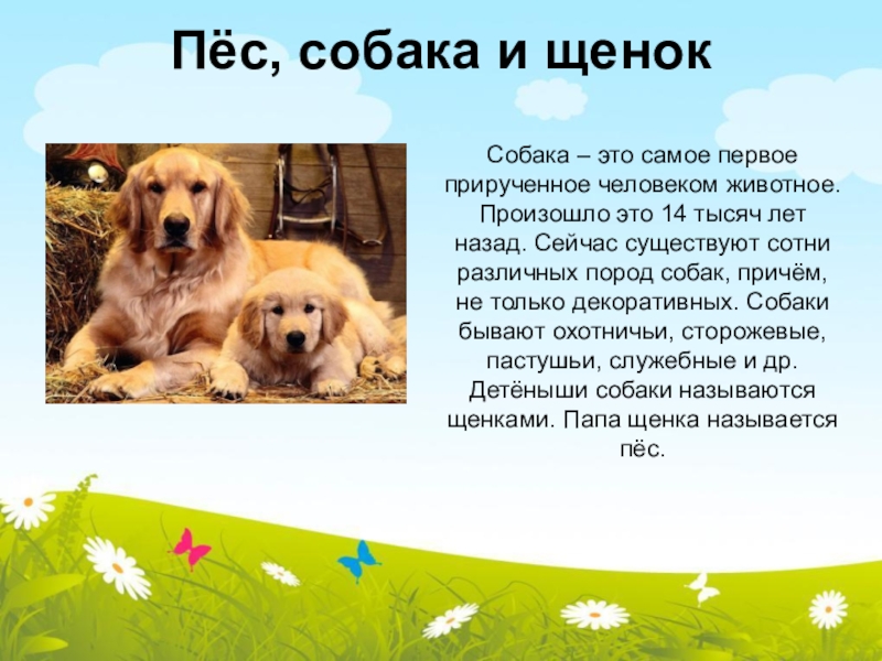 Пёс, собака и щенок Собака – это самое первое прирученное человеком животное. Произошло это 14 тысяч лет назад. Сейчас существуют сотни различных пород собак, причём, не только декоративных. Собаки бывают охотничьи, сторожевые, пастушьи, служебные и др.