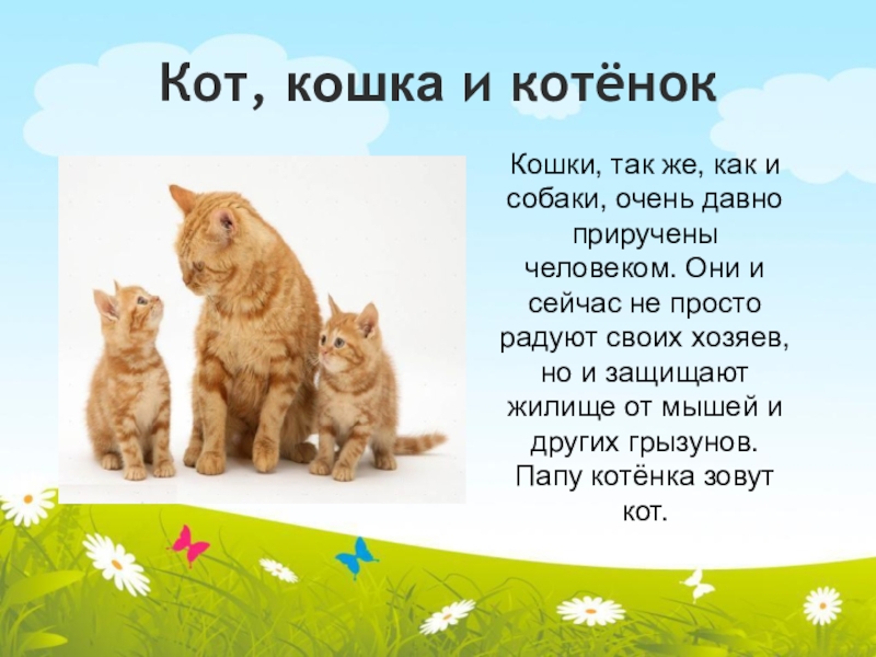 приручены человеком. Они и сейчас не просто радуют своих хозяев, но и защищают жилище от мышей и других грызунов. Папу котёнка зовут кот.
