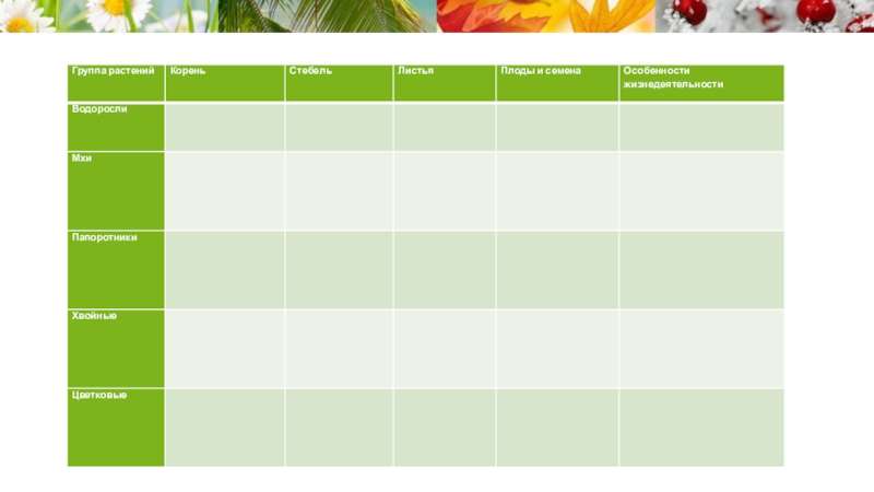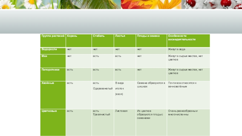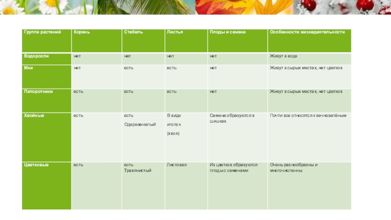 таблицу, отметив какие части (органы) имеют растения и какие не имеют (если имеют написать есть, если не имеют написать нет - представители этой группы и жизнедеятельности каждой группы.