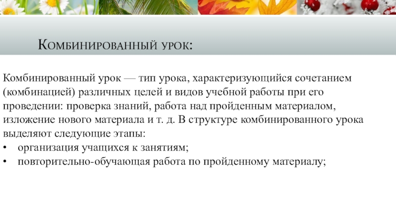Комбинированный урок — тип урока, характеризующийся сочетанием (комбинацией) различных целей