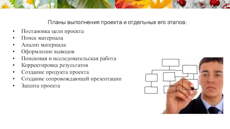 Слайд 8Планы выполнения проекта и отдельных его этапов: