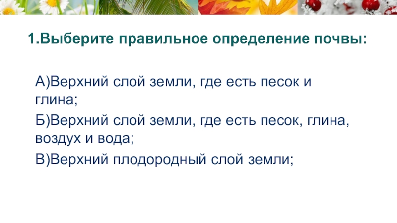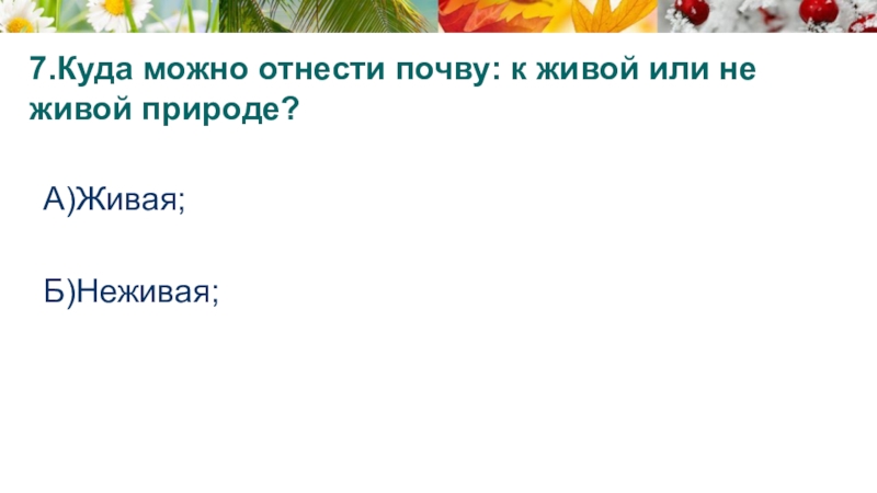 Слайд 207.Куда можно отнести почву: к живой или не живой природе?