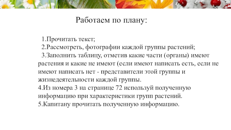 4.Из номера 3 на странице 72 используй полученную информацию при характеристики групп растений.