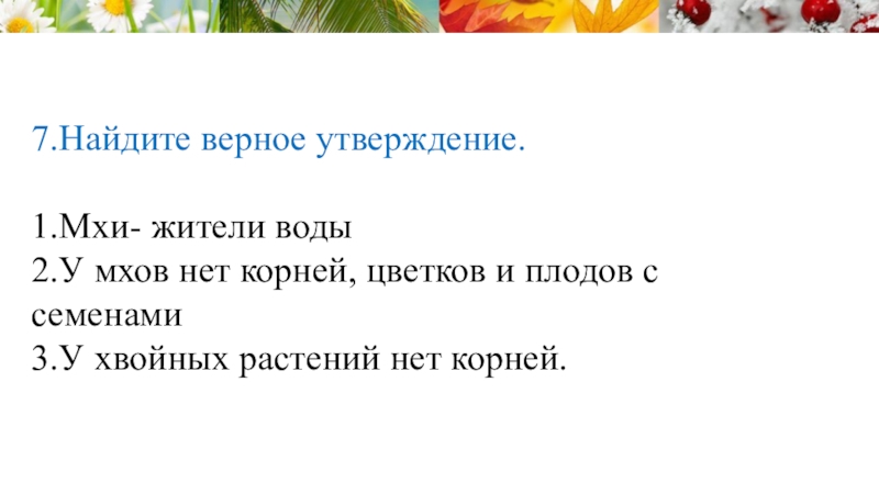 _________________ - это растения, у которых есть корень, стебель и лист, но нет цветов, плодов и семян.
