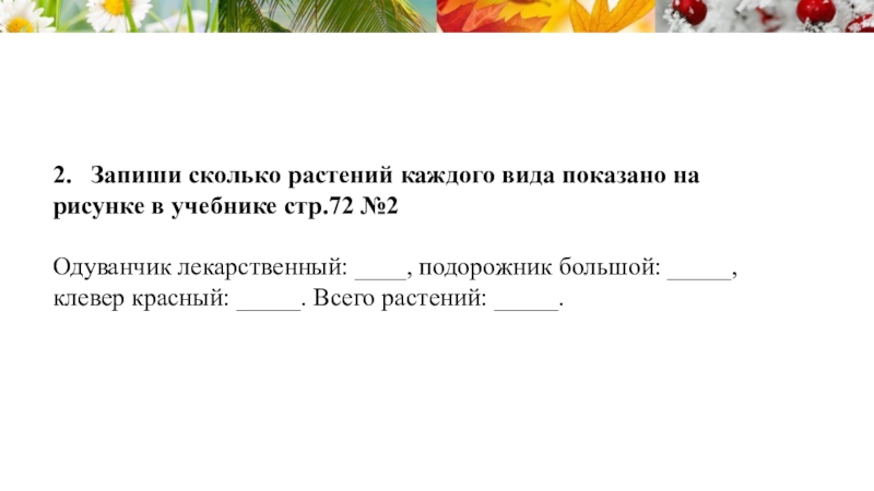 Слайд 372. Запиши сколько растений каждого вида показано на рисунке в