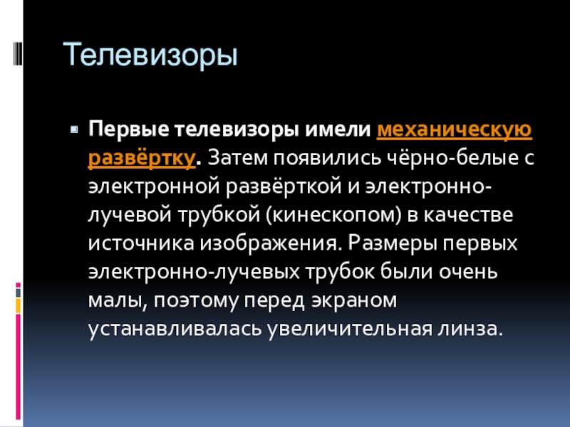 ТелевизорыПервые телевизоры имели механическую развёртку. Затем появились чёрно-белые с электронной развёрткой и электронно-лучевой трубкой (кинескопом) в качестве источника изображения.