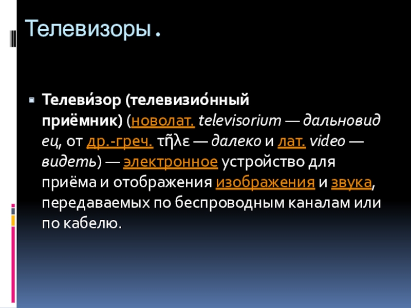 Телевизоры.Телеви́зор (телевизио́нный приёмник) (новолат. televisorium — дальновидец, от др.-греч. τῆλε — далеко и лат. video —видеть) — электронное устройство для приёма и отображения изображения и звука, передаваемых по беспроводным каналам или по кабелю.