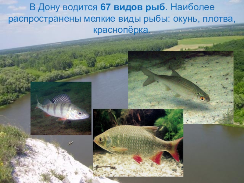 В Дону водится 67 видов рыб. Наиболее распространены мелкие виды рыбы: окунь, плотва, краснопёрка.