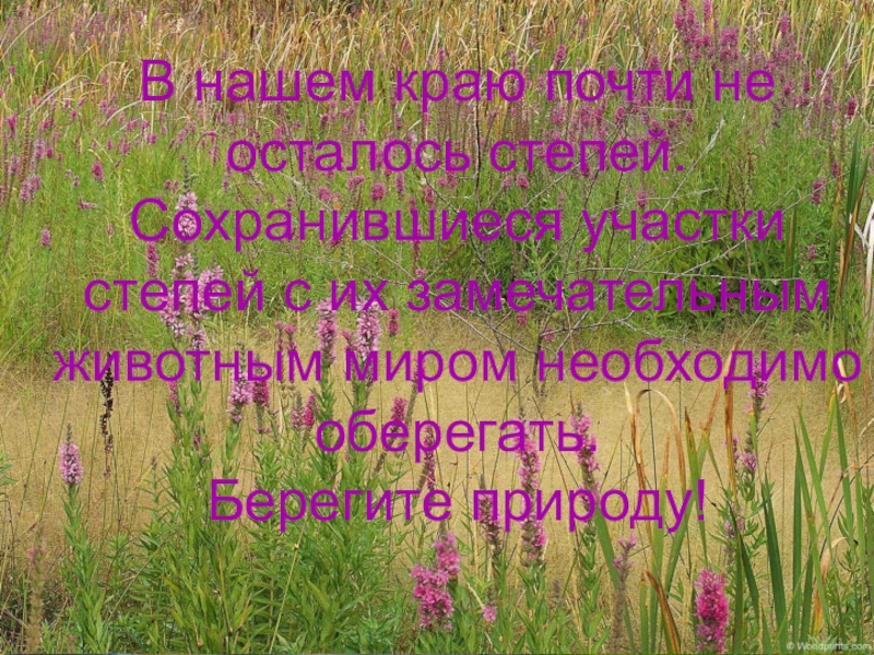 В нашем краю почти не осталось степей. Сохранившиеся участки степей с их замечательным животным миром необходимо оберегать.