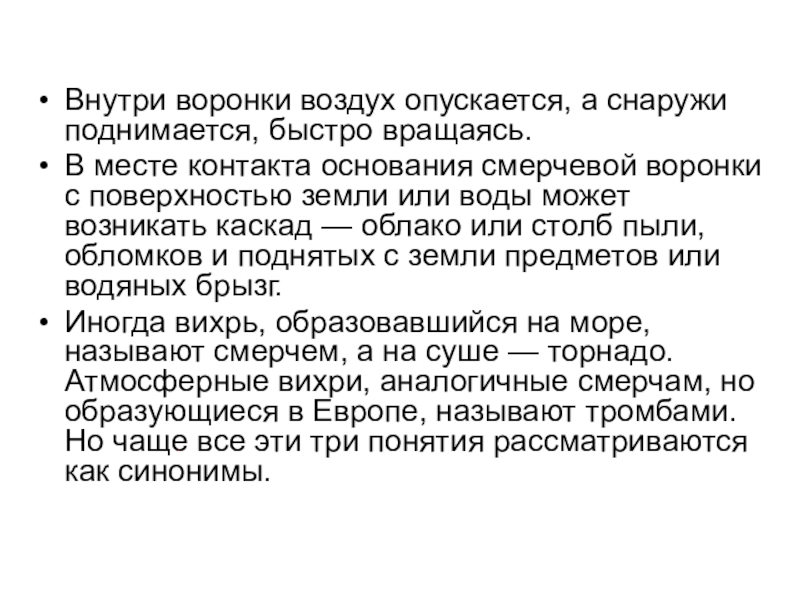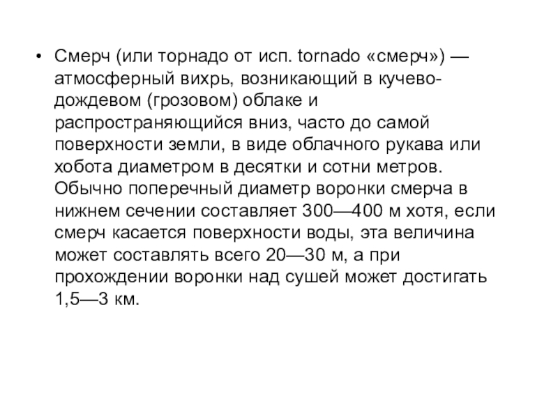 Слайд 3Смерч (или торнадо от исп. tornado «смерч») — атмосферный вихрь, возникающий