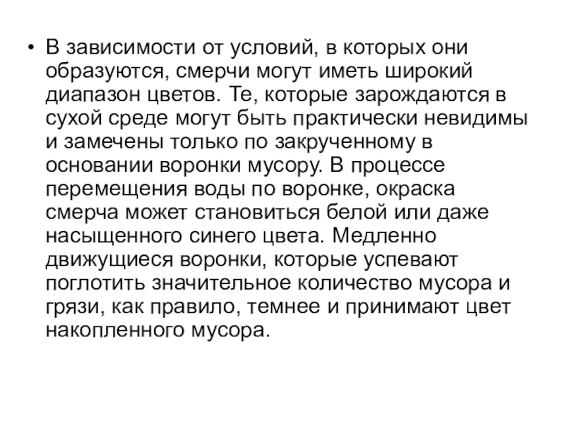 широкий диапазон цветов. Те, которые зарождаются в сухой среде могут быть практически невидимы и замечены только по закрученному в основании воронки мусору. В процессе перемещения воды по воронке, окраска смерча может становиться белой или даже насыщенного синего цвета. Медленно движущиеся воронки, которые успевают поглотить значительное количество мусора и грязи, как правило, темнее и принимают цвет накопленного мусора.