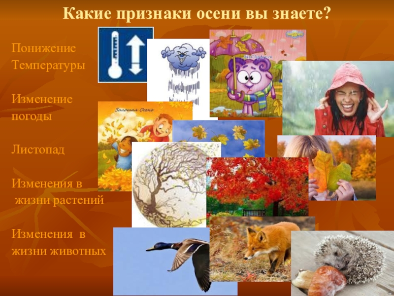 Какие признаки осени вы знаете?ПонижениеТемпературыИзменениепогодыЛистопадИзменения в жизни растенийИзменения вжизни животных