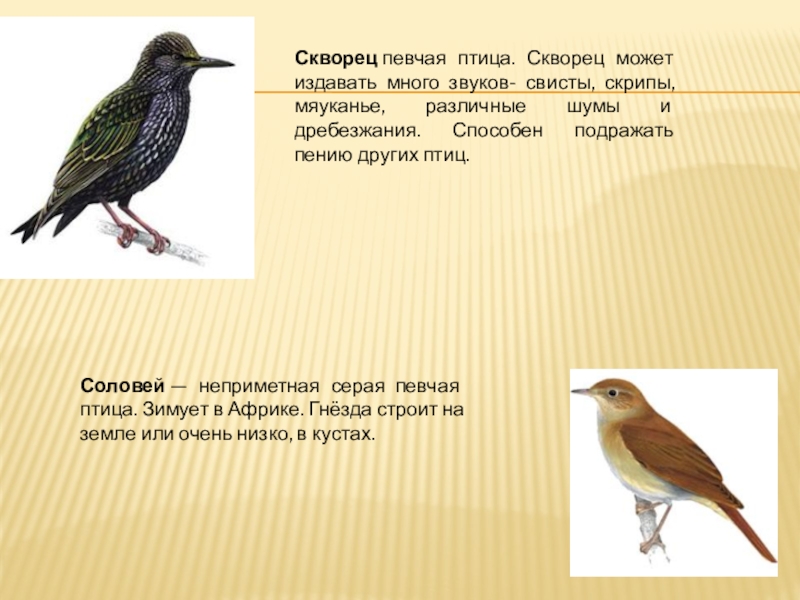 Соловей — неприметная серая певчая птица. Зимует в Африке. Гнёзда строит на земле или очень низко, в кустах.