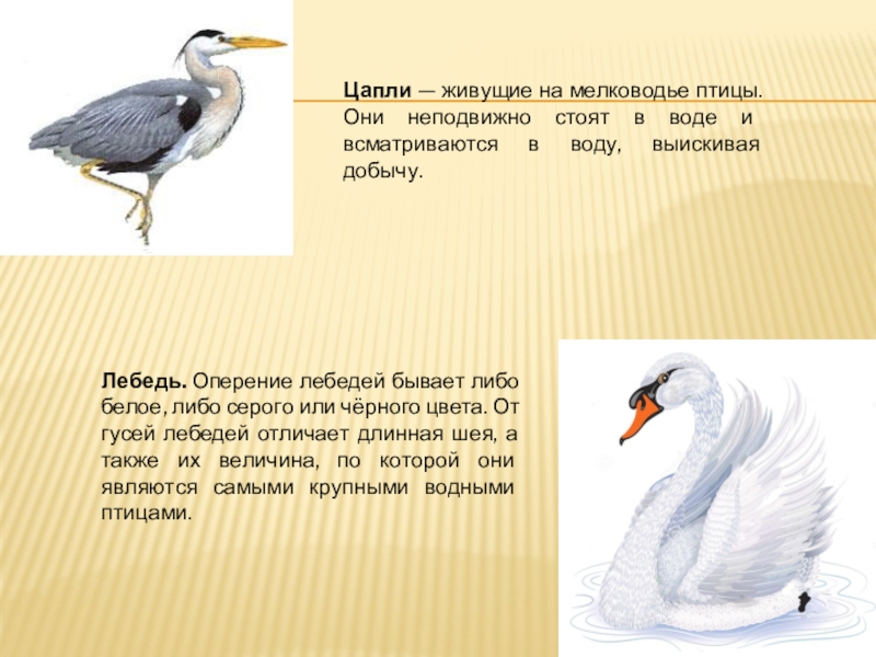 Цапли — живущие на мелководье птицы. Они неподвижно стоят в воде и всматриваются в воду, выискивая добычу.