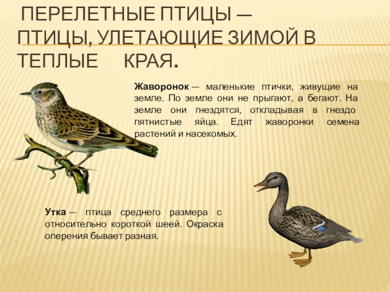 Утка — птица среднего размера с относительно короткой шеей. Окраска оперения бывает разная.
