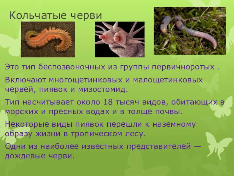 Тип насчитывает около 18 тысяч видов, обитающих в морских и пресных водах и в толще почвы.