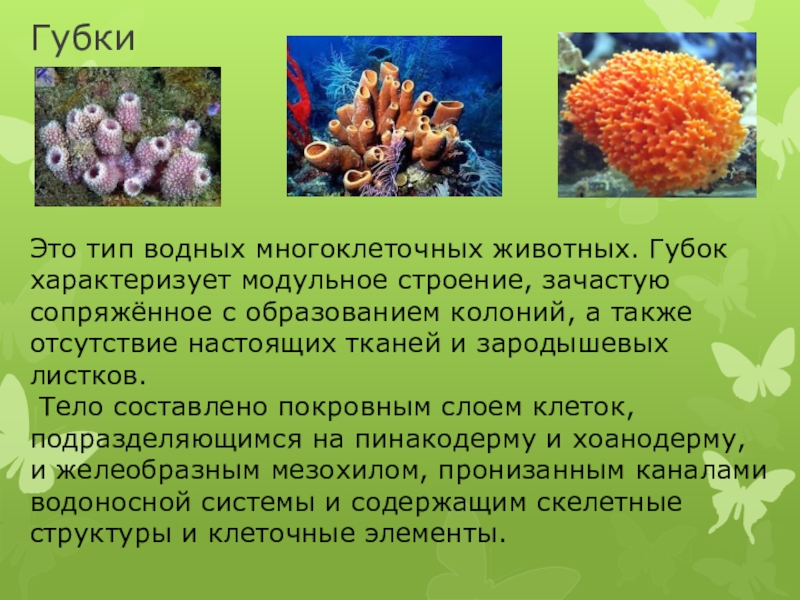 Это тип водных многоклеточных животных. Губок характеризует модульное строение, зачастую сопряжённое