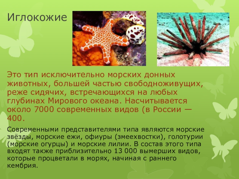 Это тип исключительно морских донных животных, большей частью свободноживущих, реже сидячих,