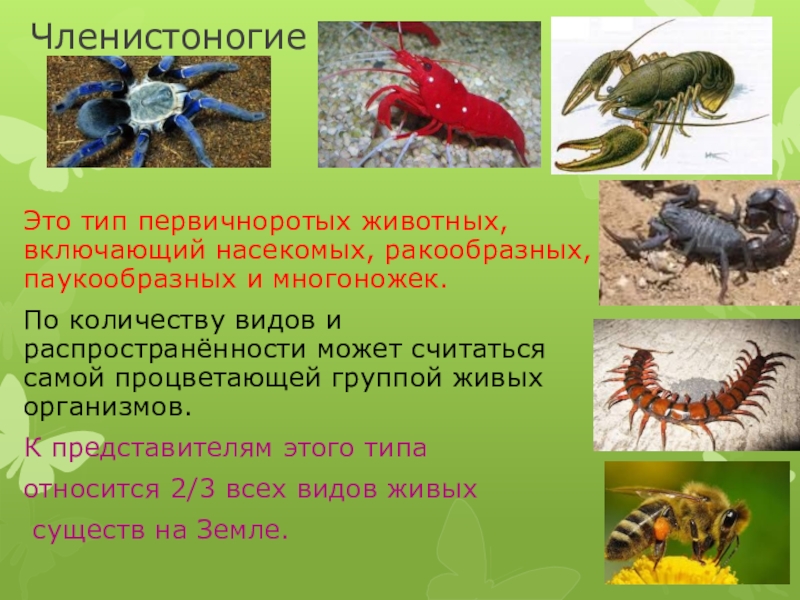 Это тип первичноротых животных, включающий насекомых, ракообразных, паукообразных и многоножек.