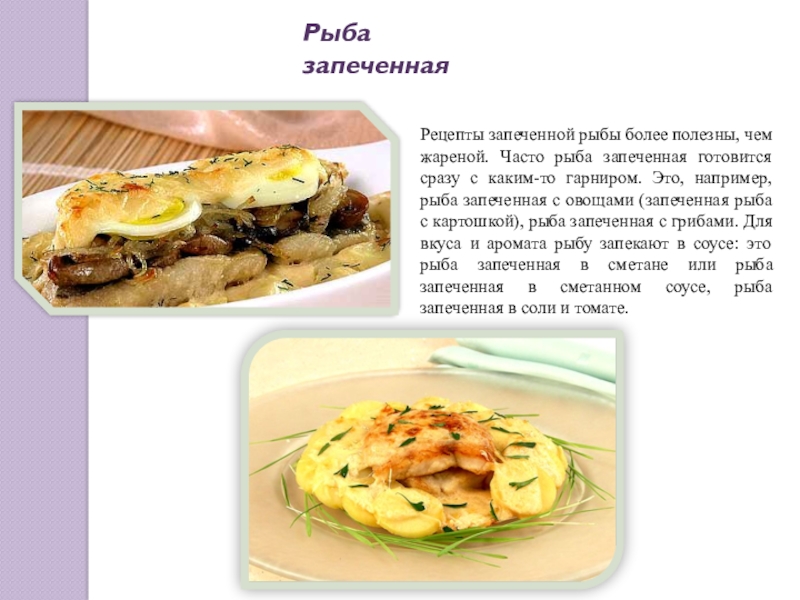 готовится сразу с каким-то гарниром. Это, например, рыба запеченная с овощами (запеченная рыба с картошкой), рыба запеченная с грибами. Для вкуса и аромата рыбу запекают в соусе: это рыба запеченная в сметане или рыба запеченная в сметанном соусе, рыба запеченная в соли и томате.