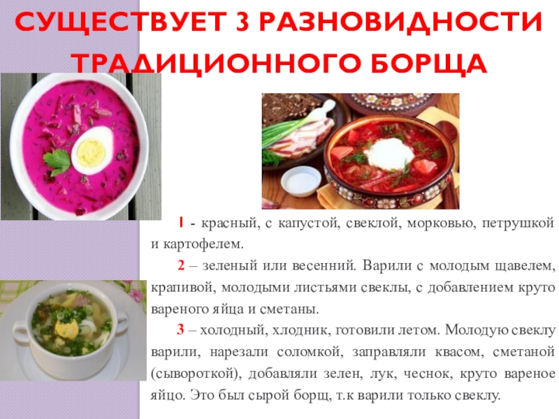 3 – холодный, хлодник, готовили летом. Молодую свеклу варили, нарезали соломкой, заправляли квасом, сметаной (сывороткой), добавляли зелен, лук, чеснок, круто вареное яйцо. Это был сырой борщ, т.к варили только свеклу.