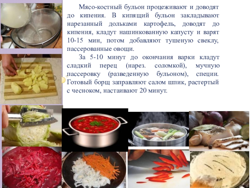 Слайд 8Мясо-костный бульон процеживают и доводят до кипения. В кипящий бульон закладывают