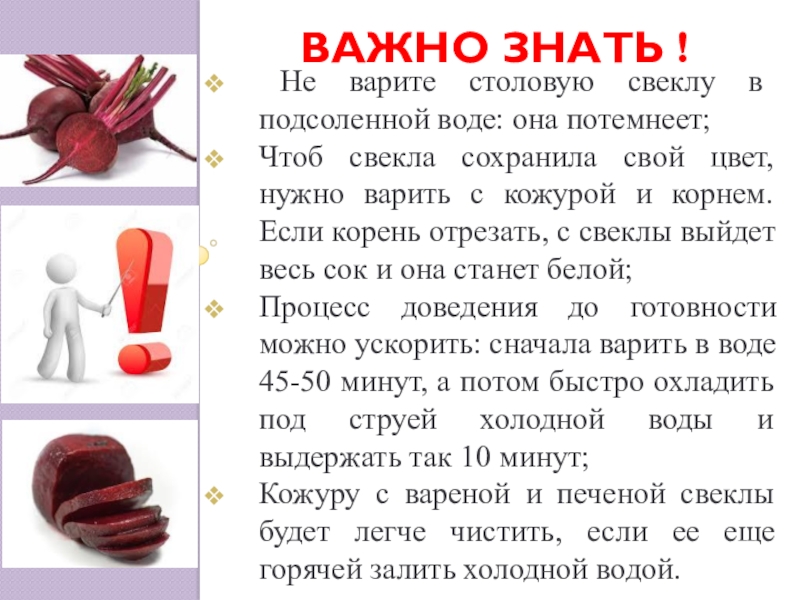 Чтоб свекла сохранила свой цвет, нужно варить с кожурой и корнем. Если корень отрезать, с свеклы выйдет весь сок и она станет белой;