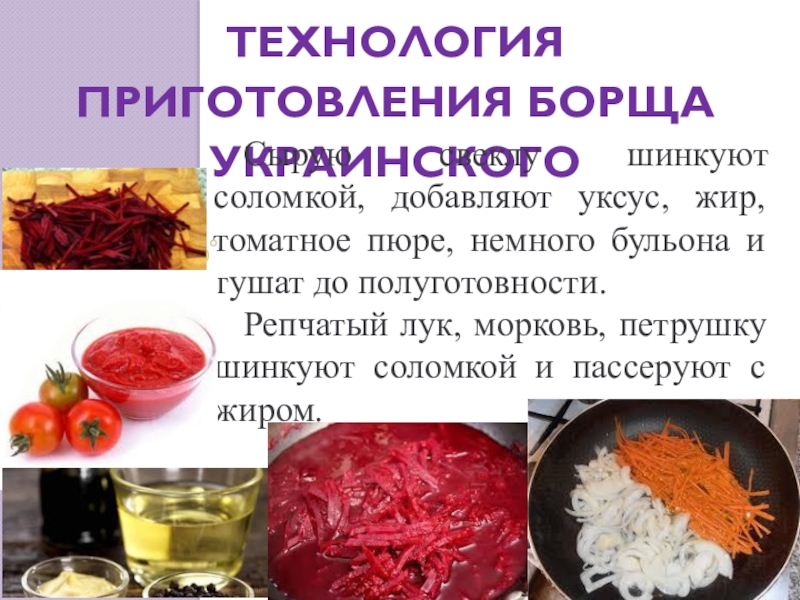 Сырую свеклу шинкуют соломкой, добавляют уксус, жир, томатное
