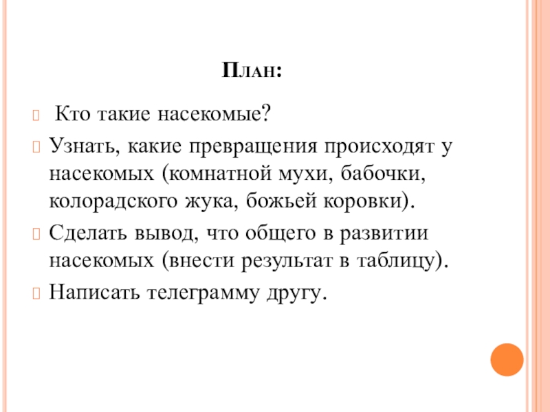План: Кто такие насекомые?Узнать, какие превращения происходят у насекомых (комнатной мухи, бабочки, колорадского жука, божьей коровки).Сделать вывод,