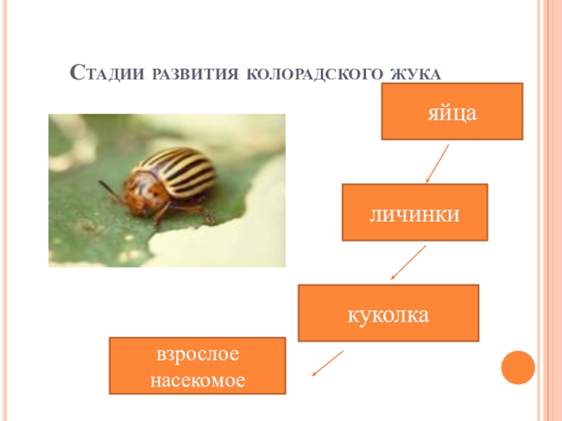 Стадии развития колорадского жукаяйцакуколкавзрослое насекомоеличинки