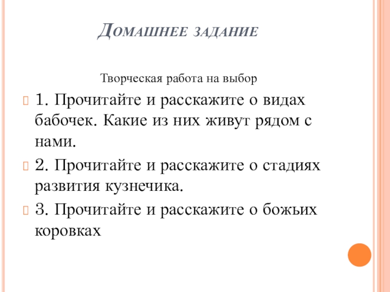 Домашнее задание Творческая работа на выбор1. Прочитайте и расскажите о видах бабочек. Какие из них живут рядом