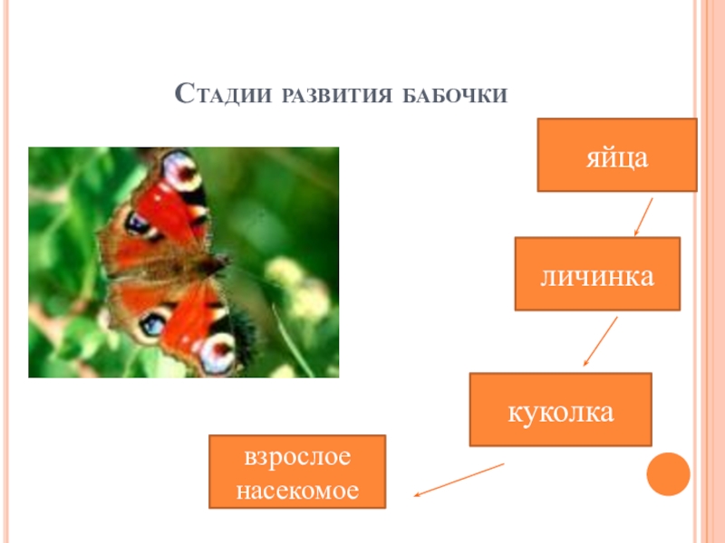 Стадии развития бабочкияйцавзрослое насекомоеличинкакуколка