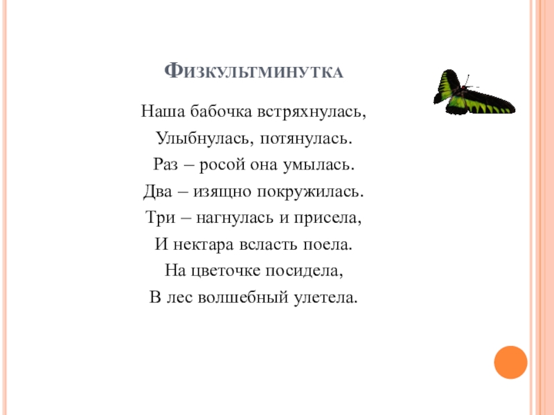 ФизкультминуткаНаша бабочка встряхнулась,Улыбнулась, потянулась.Раз – росой она умылась.Два – изящно покружилась.Три – нагнулась и присела,И нектара всласть