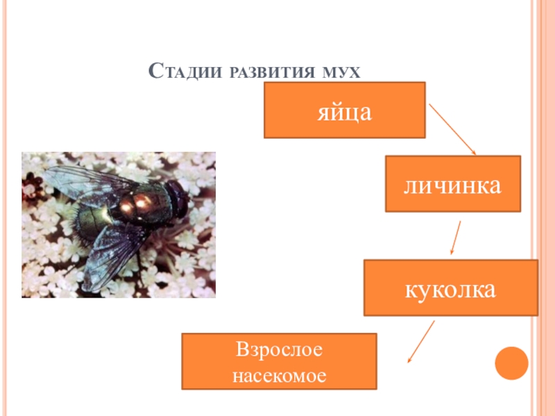 Стадии развития мухяйцакуколкаличинкаВзрослое насекомое