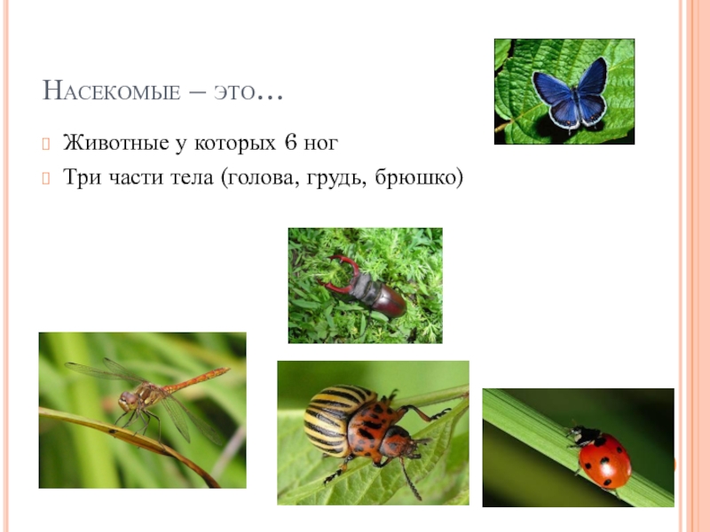 Насекомые – это…Животные у которых 6 ногТри части тела (голова, грудь, брюшко)