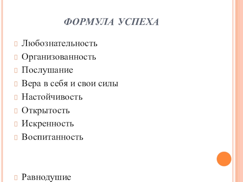ФОРМУЛА УСПЕХАЛюбознательностьОрганизованностьПослушание Вера в себя и свои силыНастойчивость ОткрытостьИскренностьВоспитанность Равнодушие ПредприимчивостьЧестностьЧувство товариществаСпособность к творчествуЗависть Ответственность Храбрость