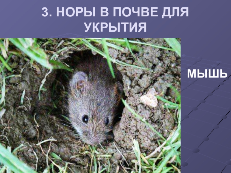 3. НОРЫ В ПОЧВЕ ДЛЯ УКРЫТИЯМЫШЬ