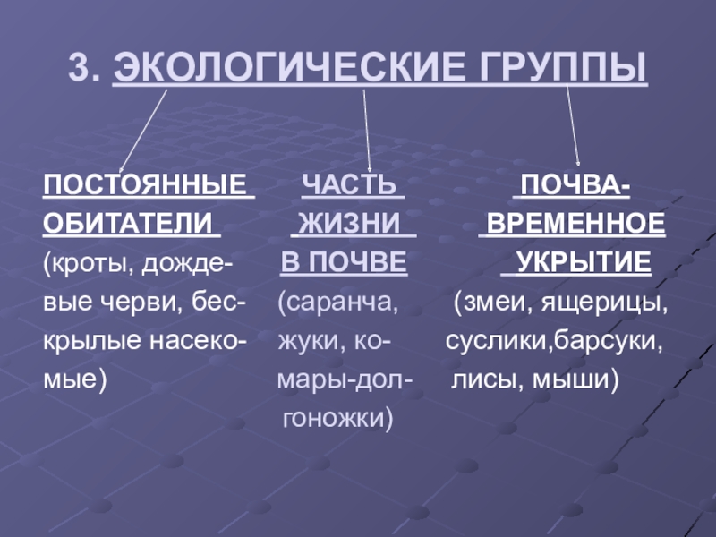 3. ЭКОЛОГИЧЕСКИЕ ГРУППЫПОСТОЯННЫЕ    ЧАСТЬ        ПОЧВА-ОБИТАТЕЛИ